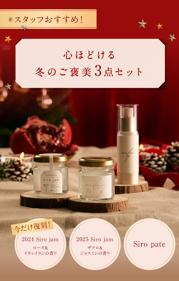 いつも HAN.d をご愛顧いただきありがとうございます。 発売開始から大好評! HAN.d売上No.1の手肌美容液「Siro jam」から、 今年もクリスマス限定セットが発売中です!