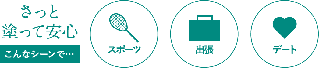 汗をかく前に塗れば、Sinai が臭いの元を抑えます。汗をかいた時や臭いが気になる場合は、ティッシュ等で汗をサッと拭き取り塗りなおしてください。